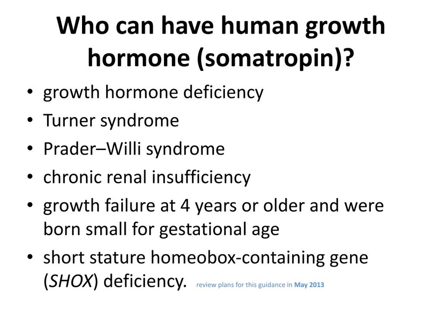 Somatropin is a form of human growth hormone important for the growth of bones and Somatropin is used to treat growth failure in children and adults who lack natural growth This includes people with short stature due to Noonan syndrome, Turner syndrome , Prader-Willi syndrome , short stature at birth with no catch-up