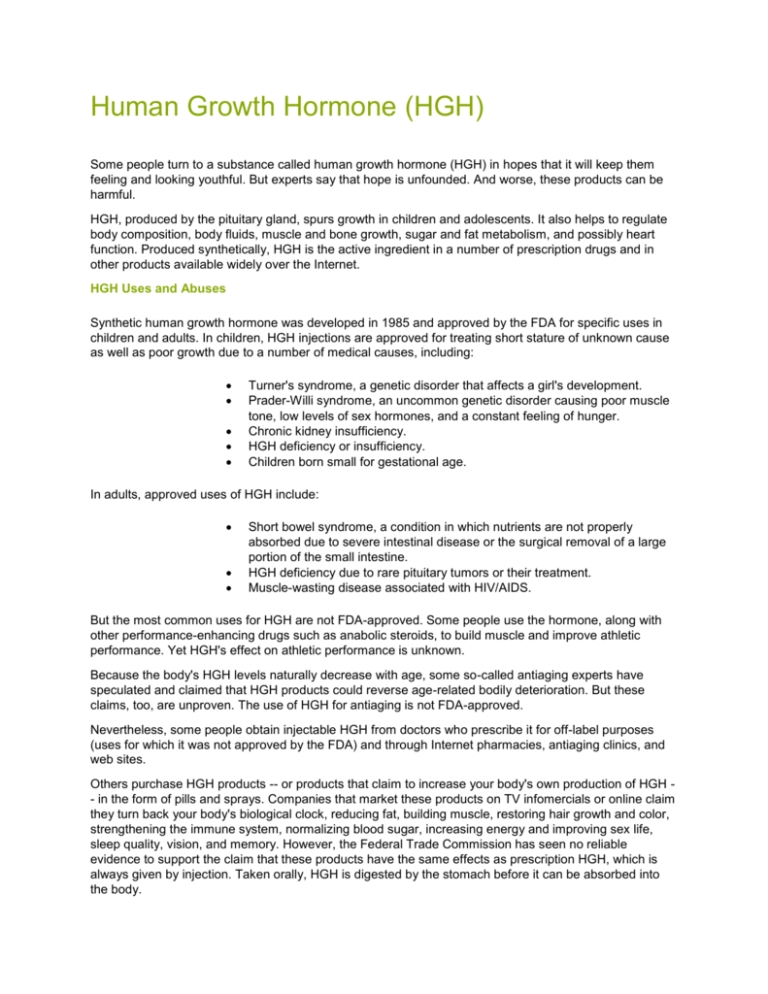 There are numerous animal and human studies evaluating the use of human growth hormone (hGH), primarily for its metabolic hGH has been used to treat growth hormone (GH) deficiency, as well as to increase energy and improve mood, increase lean body mass and muscle mass, and for its antiaging